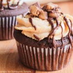 So when my son walks into the kitchen to see me finishing up the cupcakes, and sees the Reese’s cut in half he says, “My heart just stopped.” It was adorable! I had him help me place them on top until they were finished. Then I just put them on a plate and looked at him.