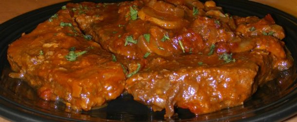 I used to make this all the time when I was younger. Would brown the round steak in an electric skillet and then add the onions, diced tomatoes and a can of tomato sauce and let it cook all day in the electric skillet – gonna make some in crock pot soon – remember it as so good.