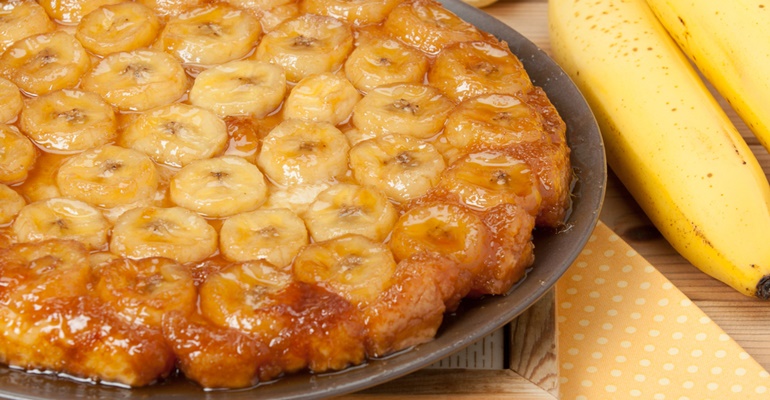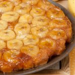 Spread caramel on the bottom of cake pan. Arrange the banana slices on top in a circular pattern.