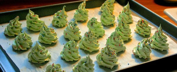 If you’re looking for a fun holiday baking project to do with your kids or grandchildren these meringue Christmas trees are the answer. Kids love to squeeze the piped meringue out into the form of trees onto the cookie sheet. Watch how accomplished they feel after they create their first little tree. It’s a very special time. I enjoy making these trees for my gingerbread house. Every gingerbread house has to have a few evergreens growing in the front yard and these meringue Christmas trees add the perfect touch. Enjoy!
