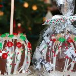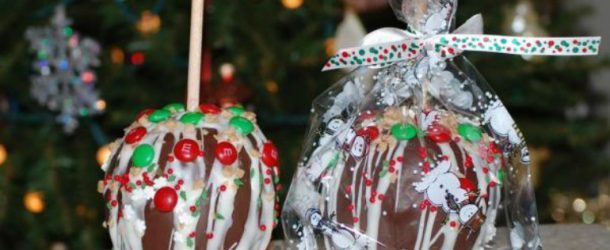 Making these caramel apples takes a bit of time but I look at it as a fun family activity to work on with your children. We set everything up at the kitchen table and had different “candy” stations for decorating. Once the apples were decorated and set, we wrapped them in holiday-themed cellophane paper and tied each one with a pretty bow. They looked great sitting on our table. We saved some for ourselves and gave the rest away as Christmas gifts to our friends and neighbors.