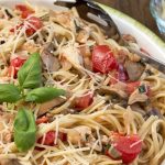 Also, if you’d like to make your own pesto, that’s fine! I chose to use store-bought since I happened to have some at hand, and I must say the meal turned out so wonderfully flavorful I couldn’t tell the difference between store-bought and homemade! You could also use whatever pasta noodles you prefer; I like to use whole grain pasta so that was my choice for this recipe. Let us know in the comments how this dish turned out for you, if you decided to tweak the recipe a little!