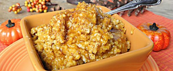 A perfect fall recipe for your slow cooker using pumpkin and healthy steel cut oats. Made without added sugars and cooked overnight so you can wake up to the fantastic smell of Pumpkin Pie in your kitchen, only without the guilt of eating pie for breakfast!